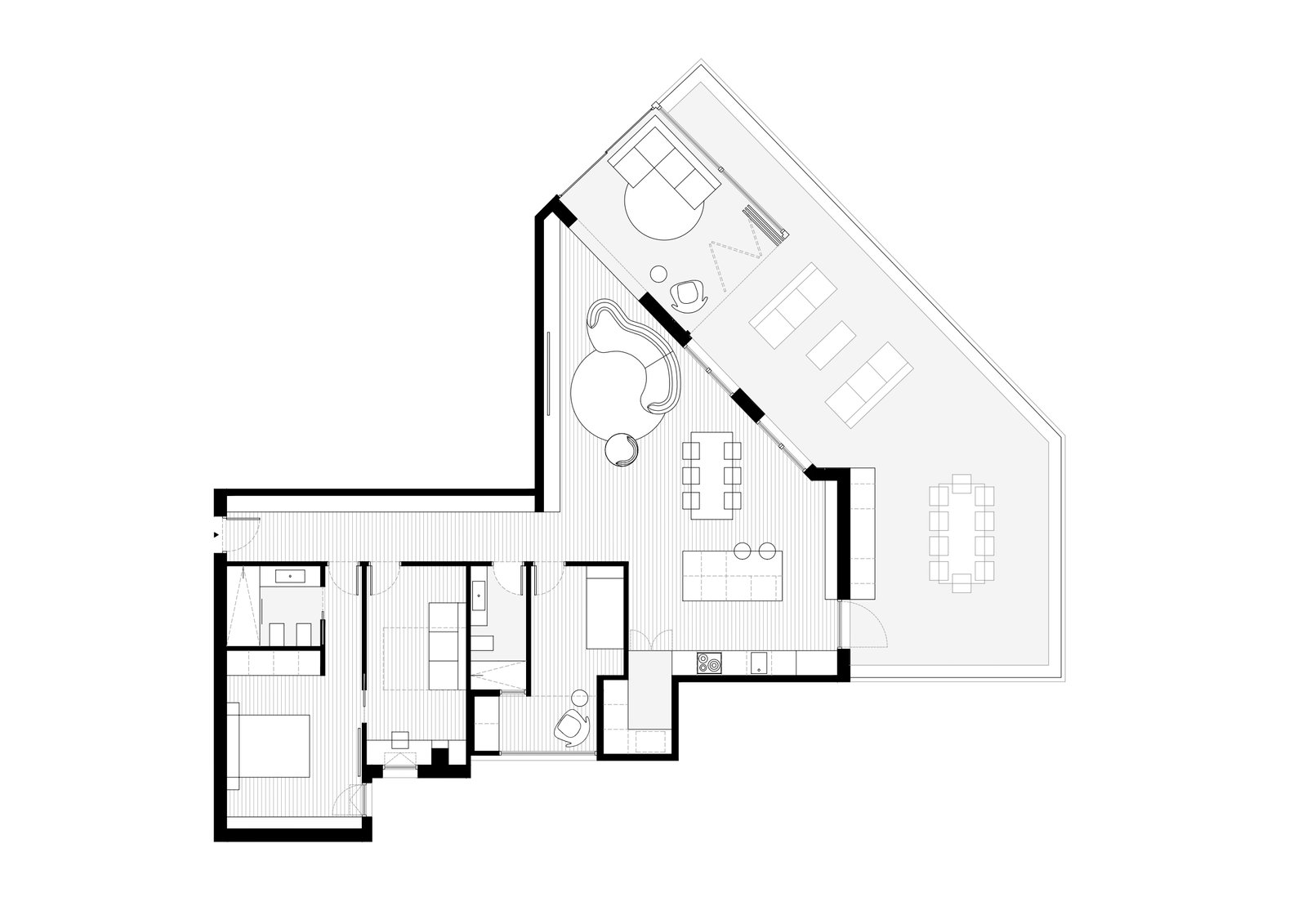 La última planta de un edificio modernista del Eixample albergaba una vivienda de cuatro dormitorios, largos pasillos y una terraza amplia pero infrautilizada. A pesar de su altura y sus vistas abiertas sobre la ciudad, la casa vivía de espaldas al exterior. La distribución fragmentada, la cocina cerrada y la sucesión de espacios compartimentados generaban una circulación rígida y poco flexible. La terraza, uno de los mayores activos de la vivienda, quedaba desconectada del día a día interior. El potencial era evidente: luz, altura y horizonte.Faltaba una estrategia capaz de abrir la casa al cielo de Barcelona.