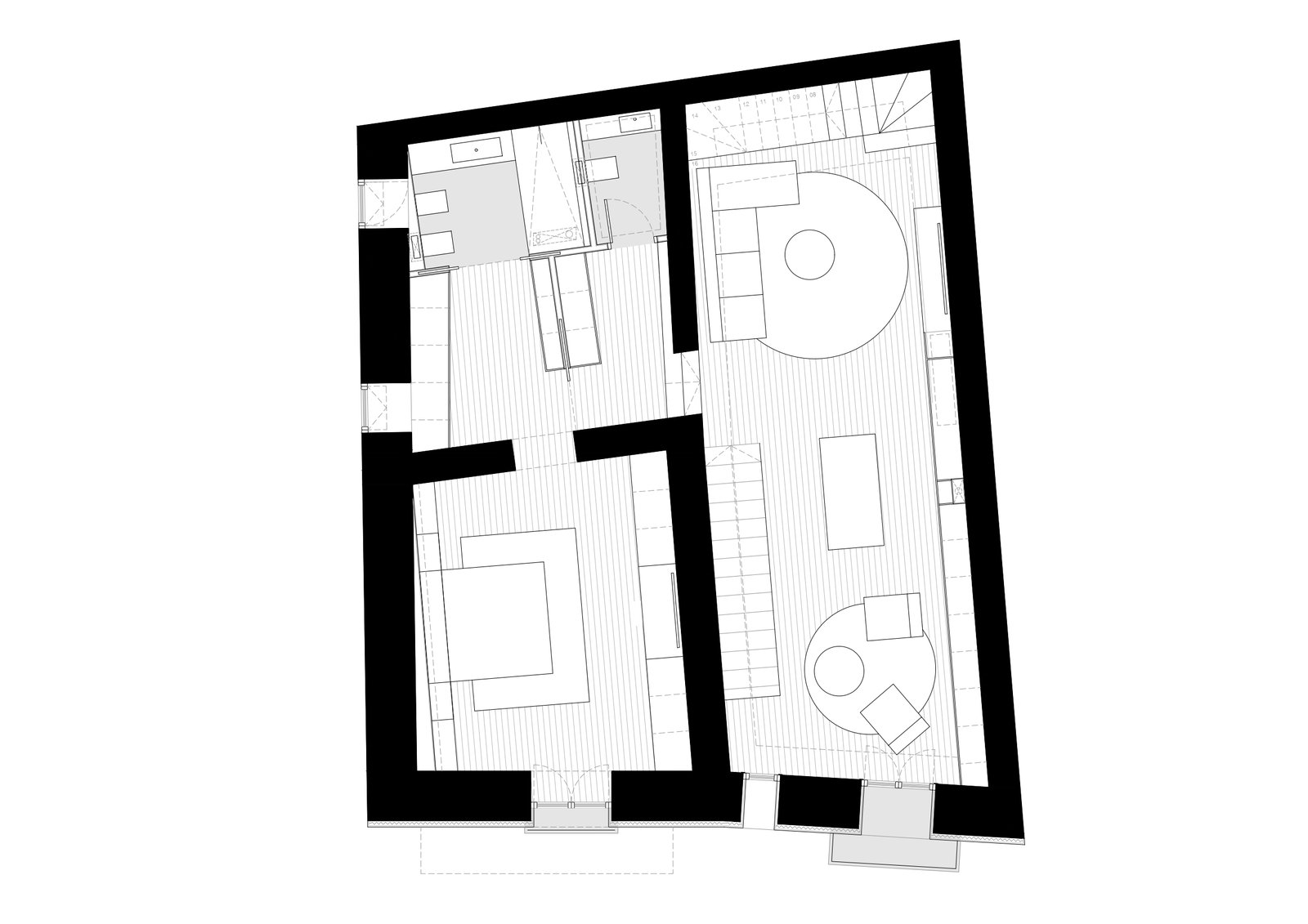 La vivienda presentaba un estado muy deteriorado, con patologías estructurales visibles, instalaciones obsoletas y una distribución fragmentada que no respondía a una lógica clara. Los muros de piedra aparecían parcialmente desnudos tras demoliciones previas, la cubierta mostraba vigas envejecidas y los espacios carecían de continuidad. La escalera, pesada y poco integrada, interrumpía la relación entre plantas. La luz natural apenas se distribuía de forma homogénea y la vivienda transmitía una sensación de abandono y desconexión material. Más que una reforma puntual, el proyecto requería una reconstrucción espacial completa.